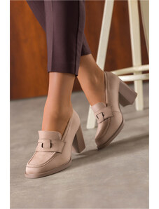 Beżowe mokasyny damskie półbuty na słupku ozdobny pasek na cholewce Carla 0715