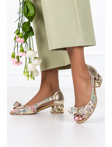 Czółenka ecru damskie z kokardą na niskim ozdobnym złotym obcasie wycięcia po bokach skórzana wkładka na cholewce kwiaty róże Casu D25X2-W