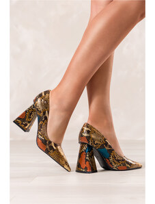 Złote czółenka damskie na geometrycznym obcasie ze skórzaną wkładką wzór wężowy Casu ER24WX2-S