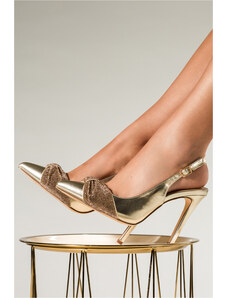 Złote czółenka damskie obcas szpilka kokarda z cyrkoniami odkryta pięta skórzana wkładka Casu JW25X3-G