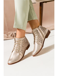Złote botki skórzane damskie wiosenne ażurowe płaskie sznurowane PRODUKT POLSKI Casu 4078-HOGL S