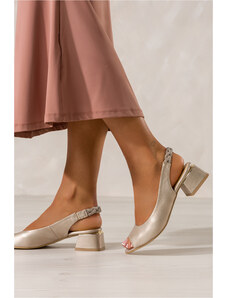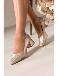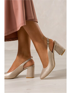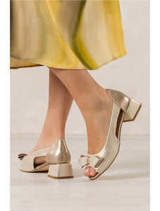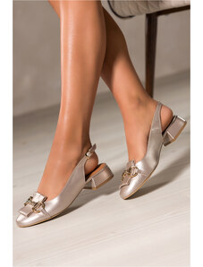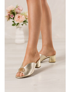 Złote czółenka skórzane damskie na ozdobnym szerokim słupku z odkrytą piętą PRODUKT POLSKI Casu 01501-1814