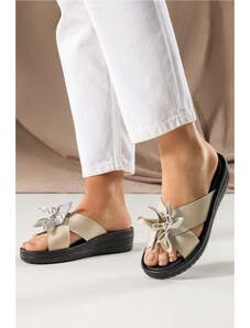 Szampańskie klapki skórzane damskie ukryty koturn złota ozdoba PRODUKT POLSKI Casu 983-M