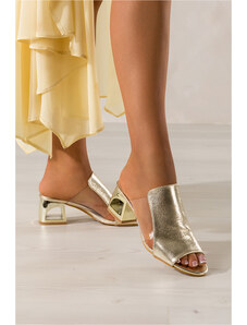 Złote klapki damskie błyszczące na ozdobnym klocku transparentne wstawki Carla M500P