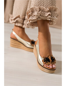 Złote sandały skórzane damskie przecierane zabudowane z kwiatami PRODUKT POLSKI Casu 3057-004