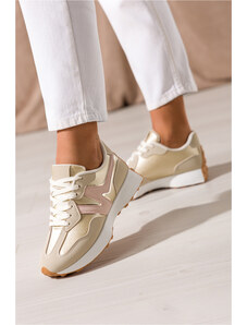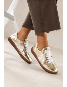 Złote sneakersy skórzane damskie buty sportowe na elastycznej podeszwie z białymi wstawkami sznurowane PRODUKT POLSKI Casu 7119-167-890