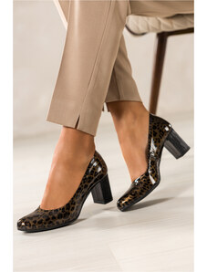 Złote czółenka skórzane damskie lakierowane ozdobny obcas słupek wzór panterki PRODUKT POLSKI Casu 2254