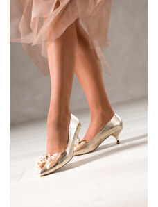 Złote czółenka skórzane damskie z kokardą na niskim ozdobnym obcasie PRODUKT POLSKI Casu 2798