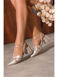Złote czółenka skórzane damskie t-bar na niskim klocku z odkrytą piętą PRODUKT POLSKI Casu 7568-291