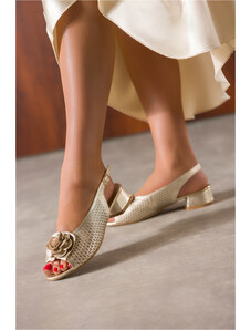 Złote czółenka skórzane damskie na niskim obcasie odkryta pięta złota ozdoba PRODUKT POLSKI Casu 7074-291