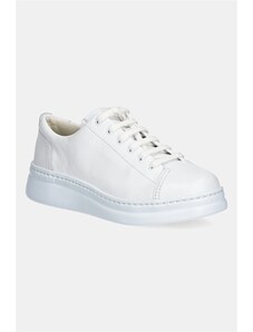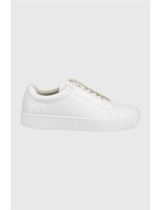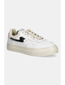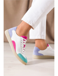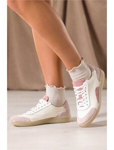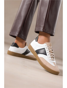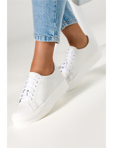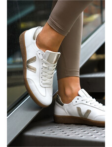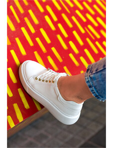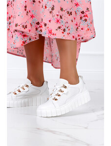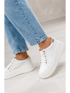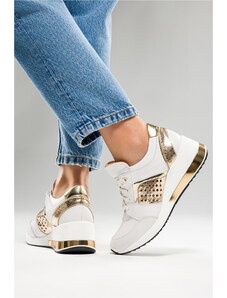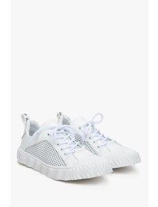 Białe sneakersy skórzane damskie buty sportowe ażurowe na elastycznej płaskiej podeszwie złote wstawki sznurowane PRODUKT POLSKI Casu M8681