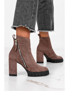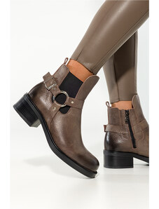 Ciemnobeżowe botki damskie na szerokim klocu ze srebrną ozdobą na cholewce stalowe kółeczko Casu D25WX1-T