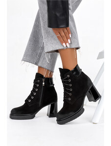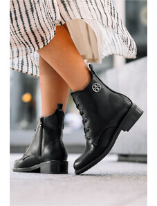 Czarne botki damskie z ozdobą na niskim klocku sznurowane Casu D24WX3-B