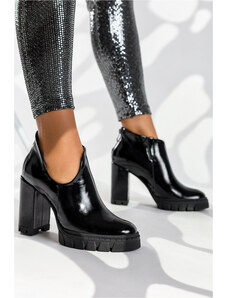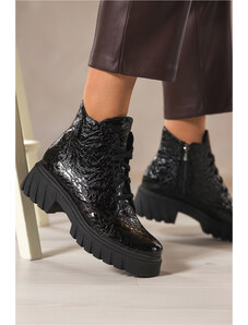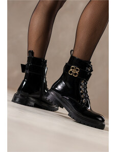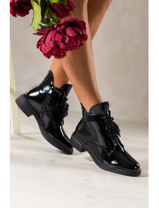 Czarne botki damskie lakierowane na bieżnikowanej platformie złota ozdoba sznurowane Casu HF234