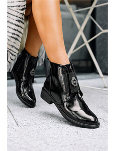Czarne botki damskie lakierowane z owadem na niskim klocku guma w cholewce Casu D24WX2-B