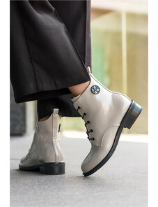 Szare botki damskie lakierowane z ozdobą na niskim klocku sznurowane Casu D24WX3-G