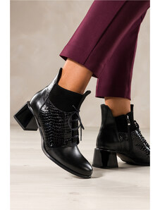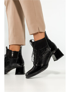 Czarne botki skórzane damskie na ozdobnym klocku lakierowane wstawki z wzorem wężowym sznurowane PRODUKT POLSKI Casu 39496