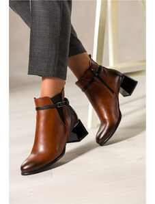 Brązowe botki skórzane damskie na ozdobnym klocku na cholewce pasek z ozdobą PRODUKT POLSKI Casu 39436