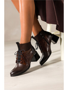 Czekoladowe botki skórzane damskie na ozdobnym klocku lakierowane wstawki z wzorem wężowym sznurowane PRODUKT POLSKI Casu 39496