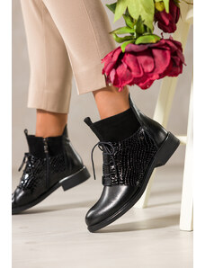 Czarne botki skórzane damskie płaskie wstawki lakierowane z wzorem wężowym sznurowane PRODUKT POLSKI Casu 39476