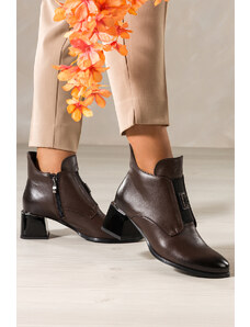 Czekoladowe botki skórzane damskie z wycięciem na szerokim obcasie ozdoba z cyrkoniami PRODUKT POLSKI Casu 8802