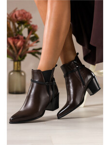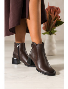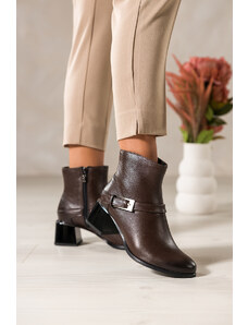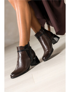 Czekoladowe botki skórzane damskie na ozdobnym klocku pasek ze srebrną klamerką PRODUKT POLSKI Casu 39437
