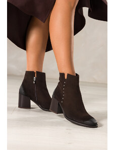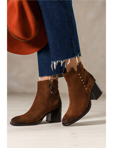 Czekoladowe botki skórzane damskie na szerokim słupku nity na cholewce PRODUKT POLSKI Casu 8863