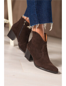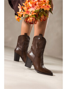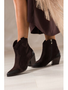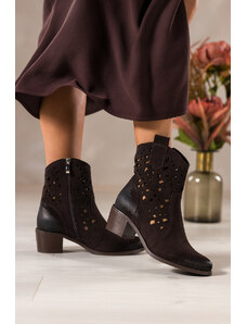 Czekoladowe botki damskie kowbojki wycięta haftowana cholewka ścięty obcas klocek Casu 8648