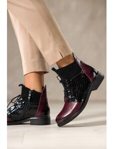 Bordowe botki skórzane damskie płaskie wstawki lakierowane z wzorem wężowym sznurowane PRODUKT POLSKI Casu 39476