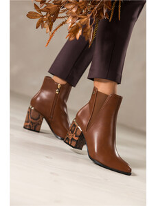 Camelowe botki damskie z gumą na ozdobnym obcasie z wzorem wężowym ze złotymi dodatkami Casu D212X10-C