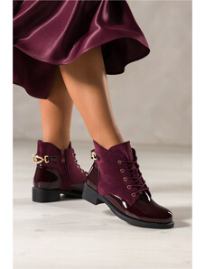 Bordowe botki damskie lakierowane na niskim klocku zamszowe wstawki złota ozdoba sznurowane Casu NW2397-6