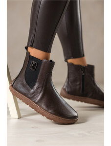 Czekoladowe botki barefoot skórzane damskie szerokie na elastycznej płaskiej podeszwie stalowa ozdoba guma w cholewce PRODUKT POLSKI Casu 69925