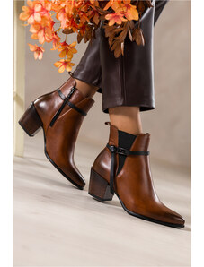 Czekoladowe botki skórzane damskie na ozdobnym klocku guma w cholewce pasek ze stalową ozdobą PRODUKT POLSKI Casu 39563