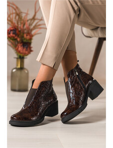 Brązowe botki skórzane damskie lakierowane z wzorem obcas klocek szeroka elastyczna guma na przodzie PRODUKT POLSKI Casu 376