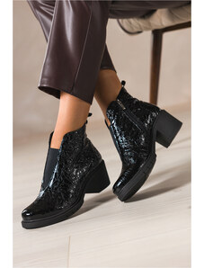 Czarne botki skórzane damskie lakierowane z wzorem obcas klocek szeroka elastyczna guma na przodzie PRODUKT POLSKI Casu 376
