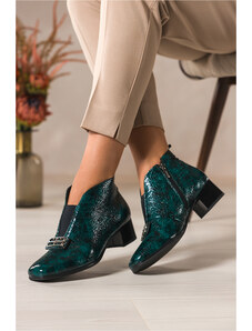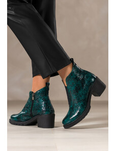 Zielone botki skórzane damskie lakierowane wzór wężowy obcas klocek elastyczna guma na przodzie srebrna ozdoba PRODUKT POLSKI Casu 378-L