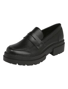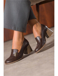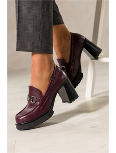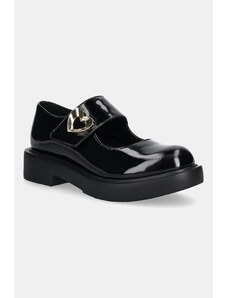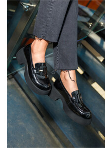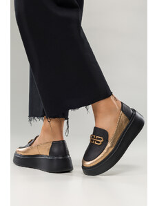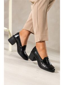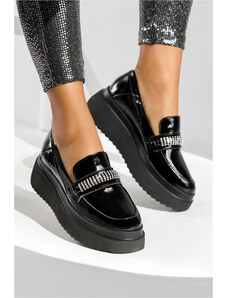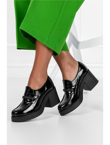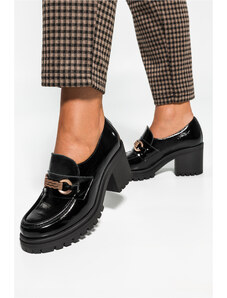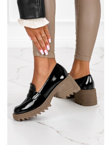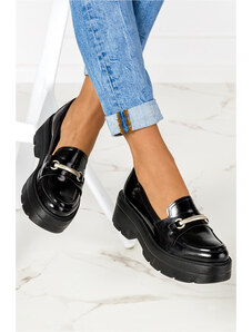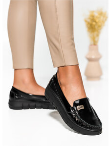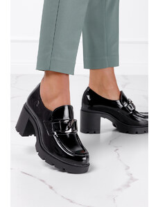 Czarne mokasyny skórzane damskie lakierowane na szerokim klocku złota ozdoba PRODUKT POLSKI Casu 20170-NO