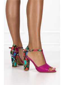 Fuksjowe sandały skórzane damskie na słupku z zakrytą piętą wzór wężowy t-bar PRODUKT POLSKI Casu 3151
