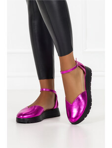 Fuksjowe sandały skórzane damskie metaliczne płaskie t-bar PRODUKT POLSKI Casu 3120