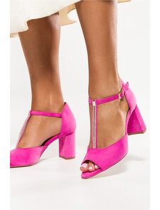 Fuksjowe sandały damskie t-bar na ozdobnym słupku z zakrytą piętą skórzana wkładka ozdoba na kostce Casu D24X9-F