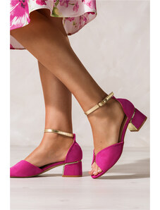 Fuksjowe sandały damskie na ozdobnym klocku z zakrytą piętą pasek wokół kostki złote dodatki skórzana wkładka Casu ER23X8-F