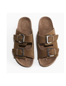 Klapki z zaokrąglonym przodem i regulowanymi skrzyżowanymi paskami z metalową klamrą.