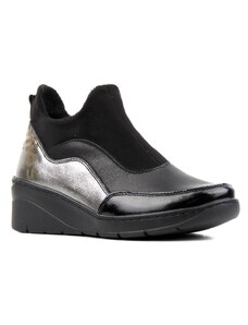 Oryginalności fasonowi nadaje połyskująca skórzana wstawka na pięcie i z przodu cholewki, oraz subtelne logo marki z boku cholewki i na suwaku.