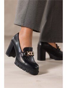 Czarne mokasyny damskie półbuty ze złotą ozdobą obcas słupek Carla NW2412-8