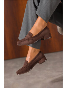 Estro: Ciemnobrązowe mokasyny damskie typu Penny z włoskiego weluru naturalnego Premium