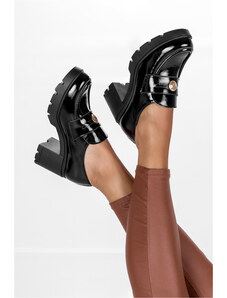 Czarne mokasyny skórzane damskie lakierowane na koturnie ozdobny warkocz z cyrkoniami PRODUKT POLSKI Casu 989P