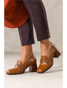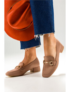 Camelowe mokasyny skórzane damskie na ozdobnym klocku złota sprzączka PRODUKT POLSKI Casu 7317-819