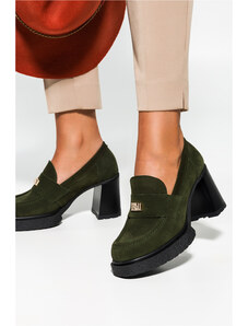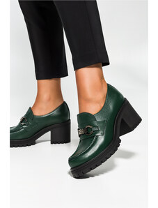 Zielone mokasyny skórzane damskie ze srebrną ozdobą na szerokim klocku PRODUKT POLSKI Casu 20175