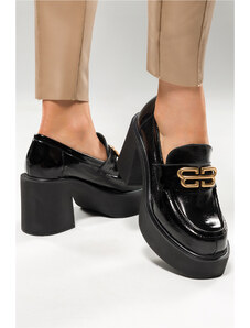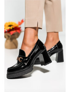 Czarne mokasyny skórzane damskie lakierowane na szerokim klocku złota ozdoba PRODUKT POLSKI Casu 20170-NO