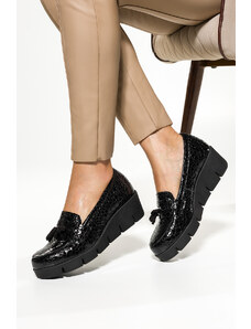 Czarne mokasyny skórzane damskie lakierowane na koturnie z chwostami wzór wężowy PRODUKT POLSKI Casu 5933